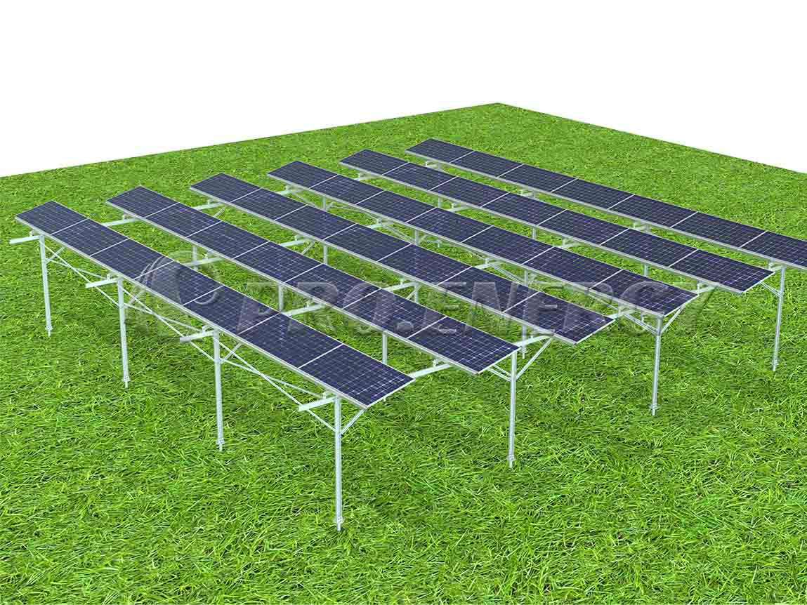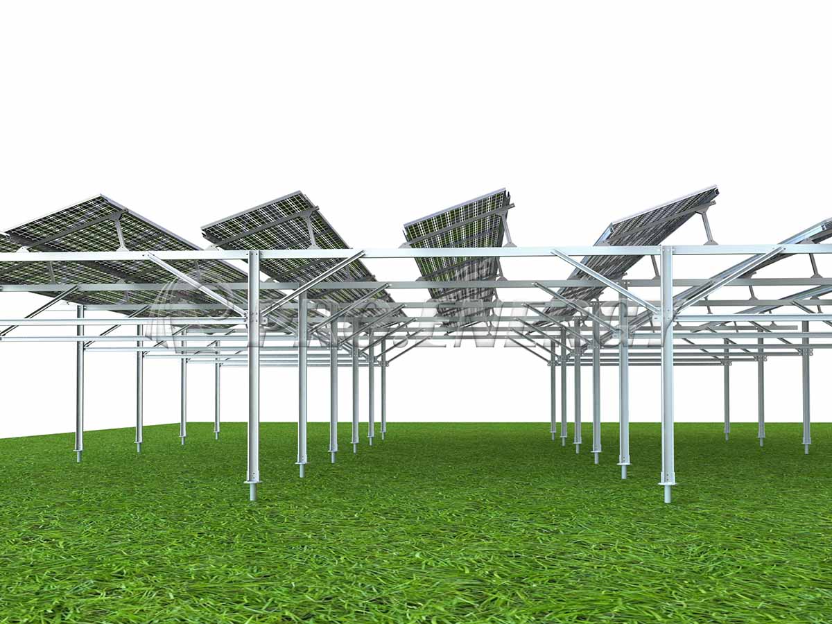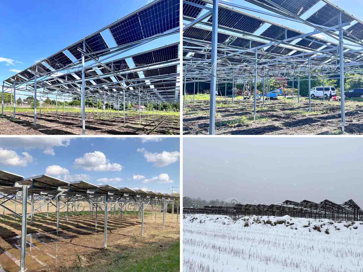 A:フレーム式および単柱式の農業用太陽光発電架台。あらゆる形状の構造物を提供可能です。
