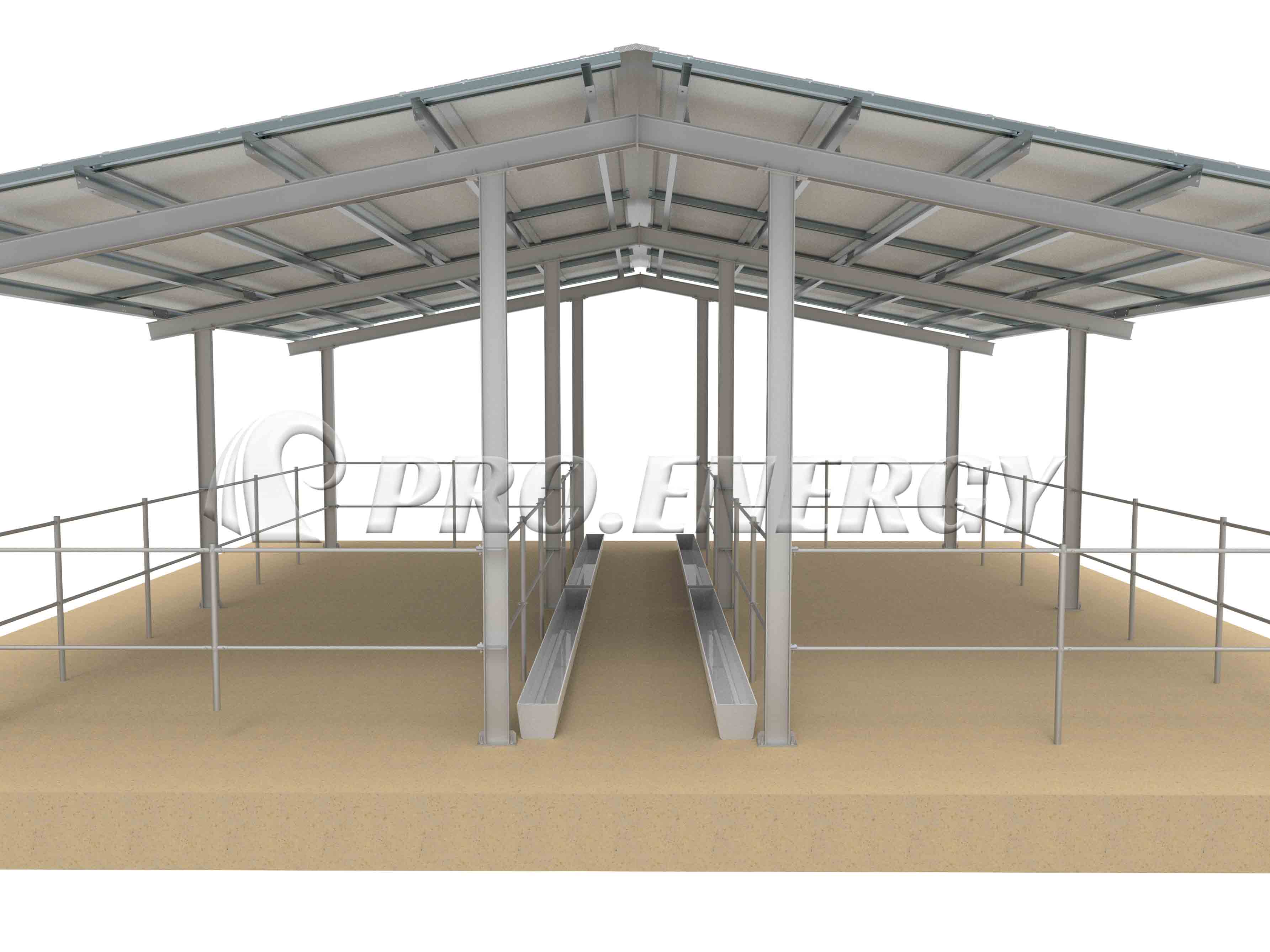 この機能的な牛舎は、ソーラーパネルを組み込むことで、家畜に日陰と悪天候からの保護を提供すると同時に、搾乳機や高圧洗浄機を動かすための電力を発電します。牛が自由に動き回れる十分なスペースを確保した構造設計により、動物福祉の向上を図っています。シンプルな構造はコスト削減に貢献し、建設とメンテナンスが容易なため、現代の農場にとって経済的かつ環境に優しいソリューションとなっています。
