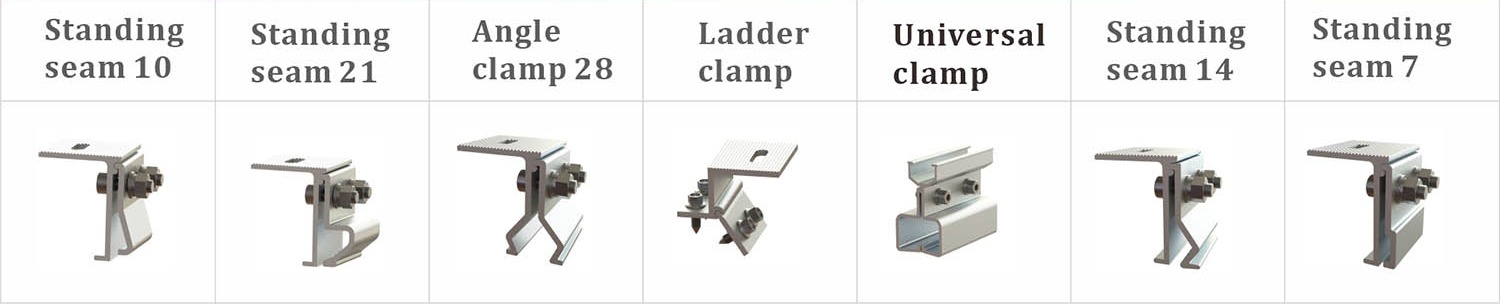 A:L字型脚システム、立ちはぜ式システム、ミニレールシステム、フックシステム、バラストシステム、BIPV防水システム、傾斜角度システム。