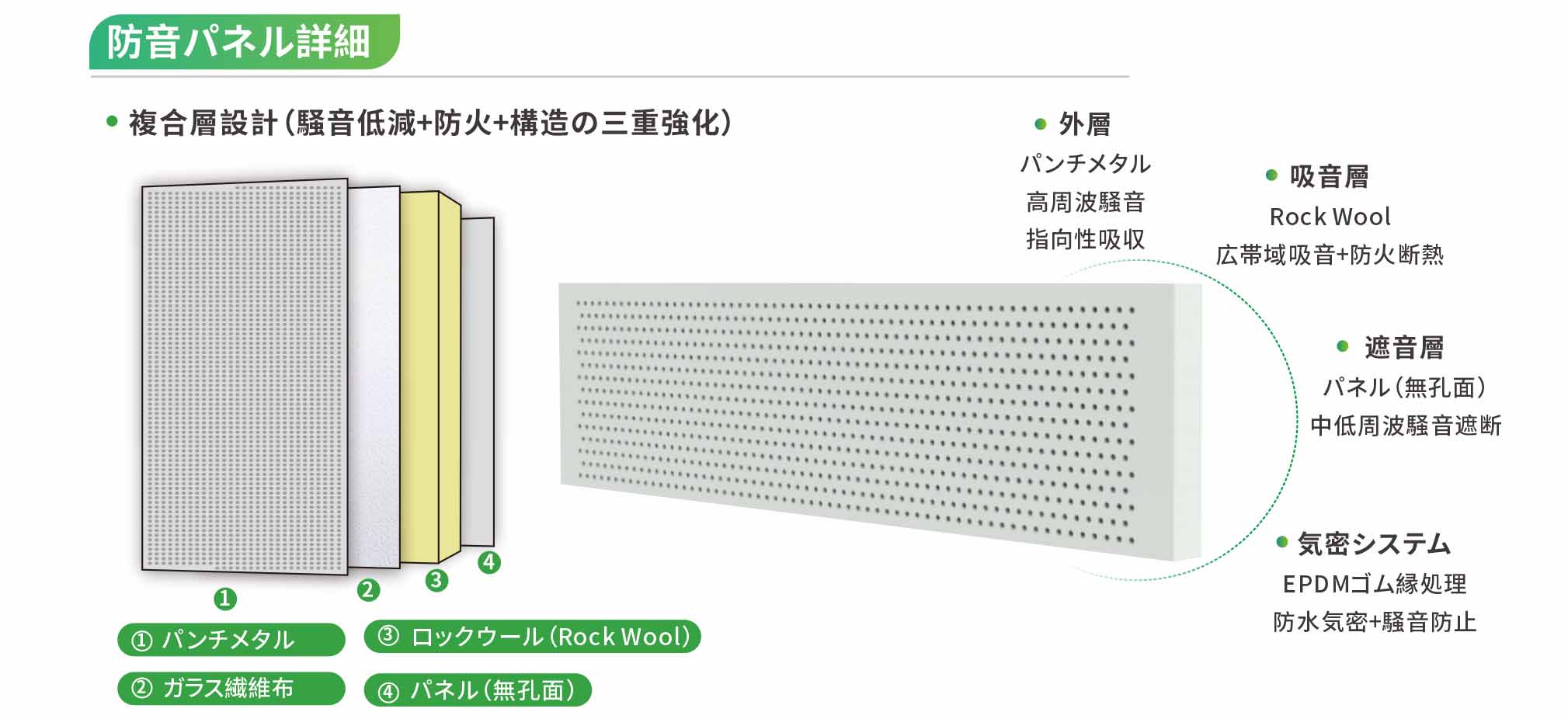 交通量の多い高速道路や都市インフラから、変電所、工業施設、蓄電池貯蔵施設まで、この防音壁は柔軟な高さ構成で、お客様のニーズに合わせて設置できます。高強度炭素鋼製のフレームは優れた耐風性と長期的な構造的完全性を確保し、高密度ロックコットンを充填した穴あき金属板は卓越した防音性能を発揮します。溶融亜鉛めっきと静電粉体塗装仕上げにより、優れた耐腐食性と耐候性を備え、あらゆる気候条件下で最適な性能を維持します。