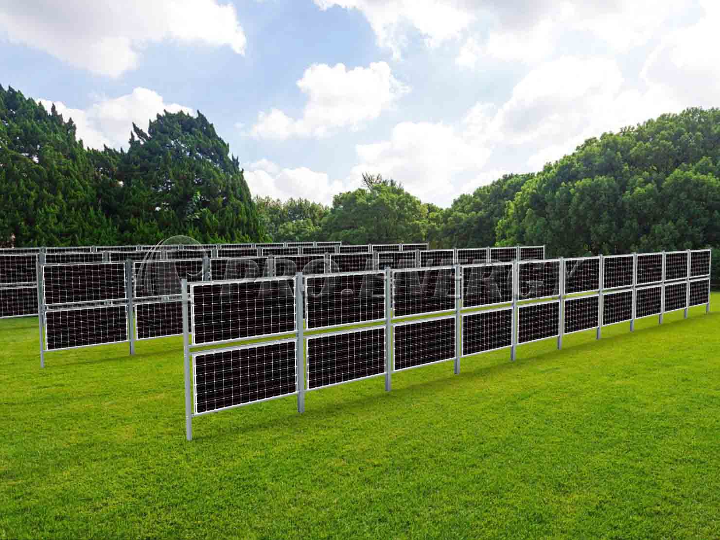 プロフェンス・エナジーは、両面受光型二重ガラス太陽電池モジュールを採用した垂直型太陽光発電フェンスで、家畜の放牧地を囲うのに最適です。頑丈で機能的な構造は、発電するだけでなく、耐久性と耐候性にも優れています。フェンスの列間の間隔が広いため、大型の農業機械も容易に通過でき、従来のフェンスに代わる実用的でエネルギー効率の高い選択肢となります。